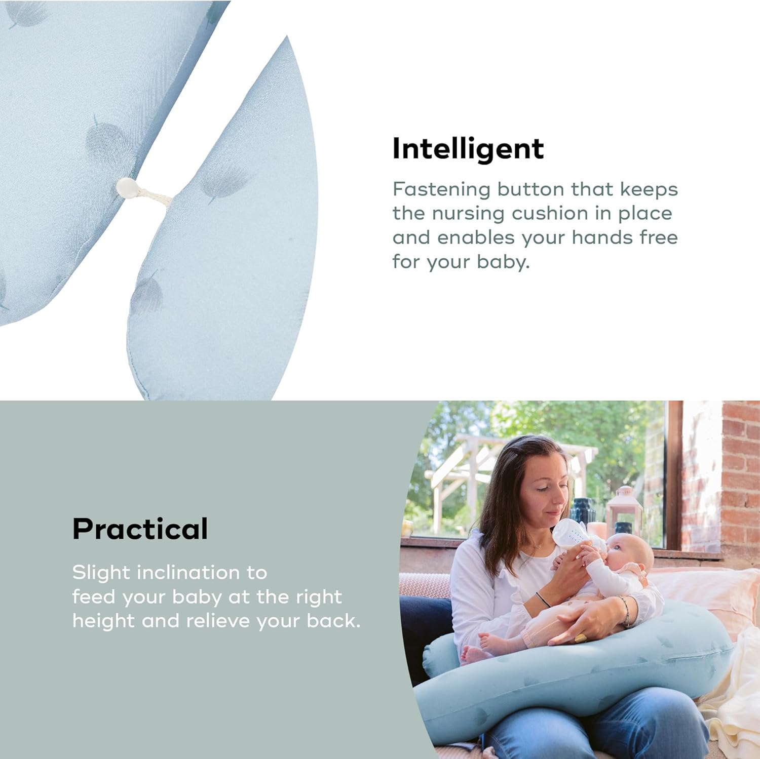 Breastfeeding cushion: This cushion is also ideal for breastfeeding (madonna style, rugby ball, lying down etc.) or bottle feeding. Your baby will be at the right height and your back properly supported