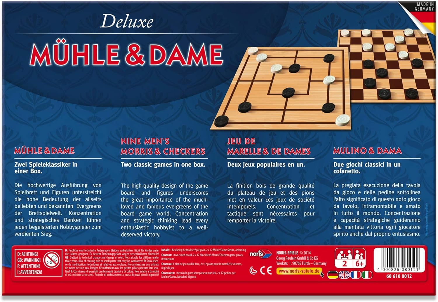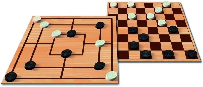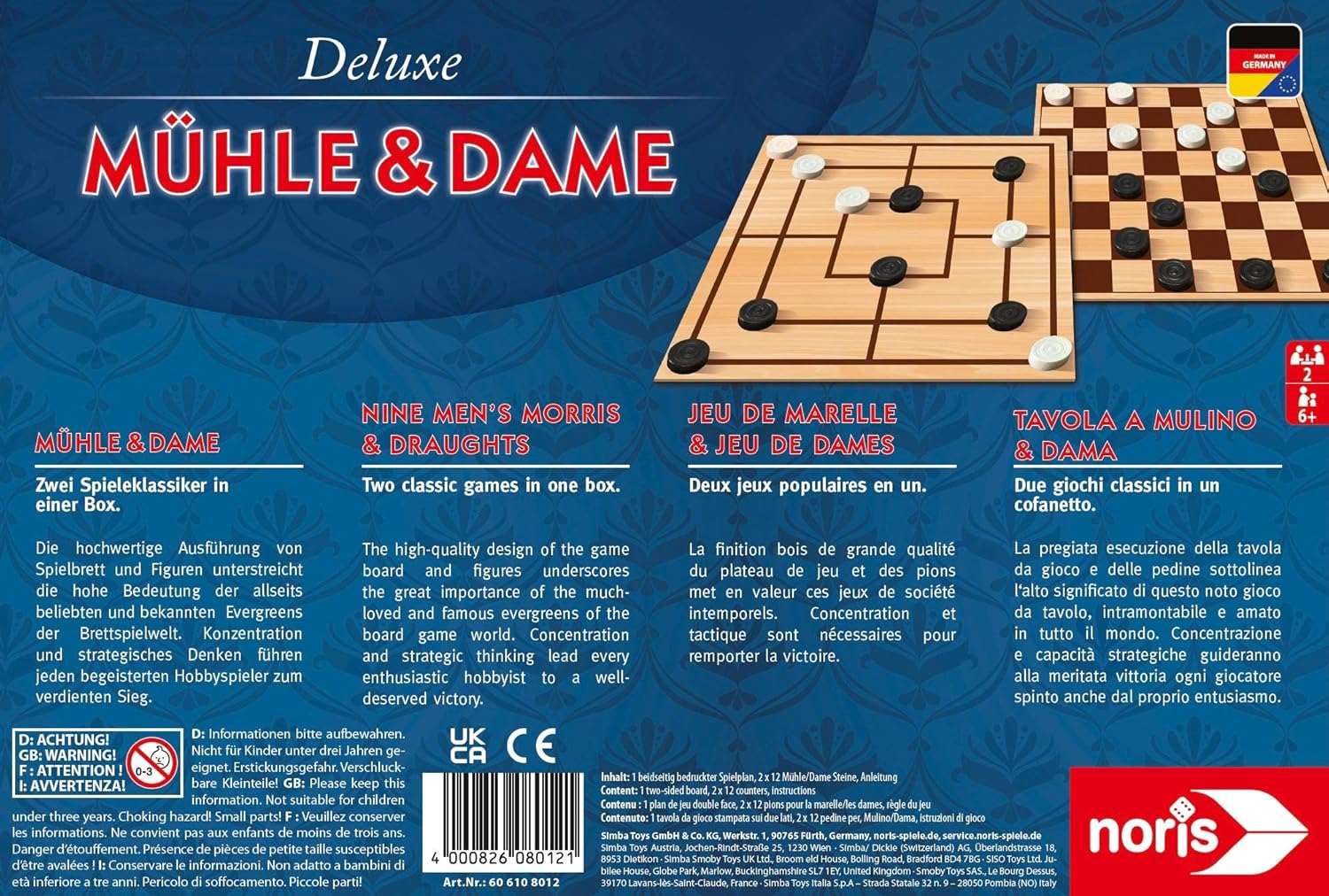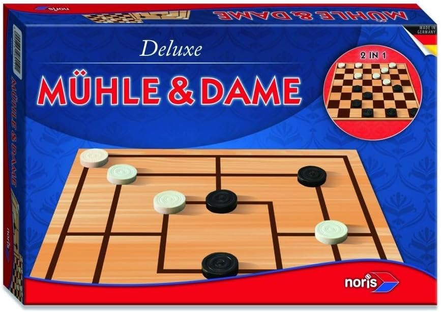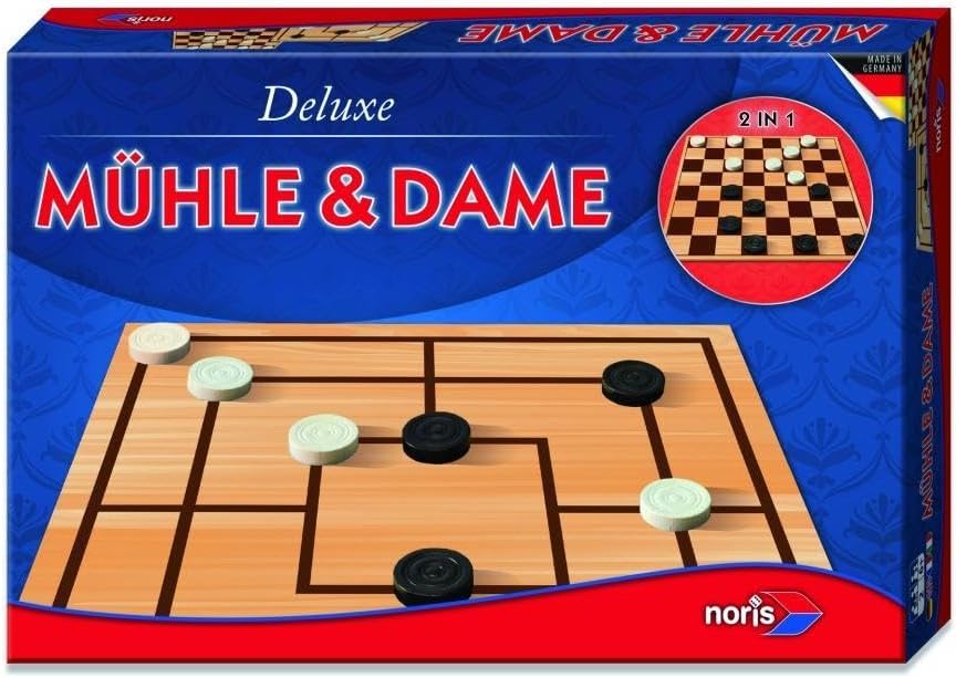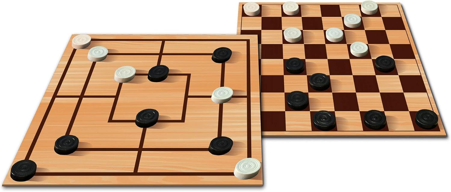 Two classic sets, morris and checkers in one box, no wooden cardboard. For 2 players aged 6 years and older Language: D, GB, F, I.