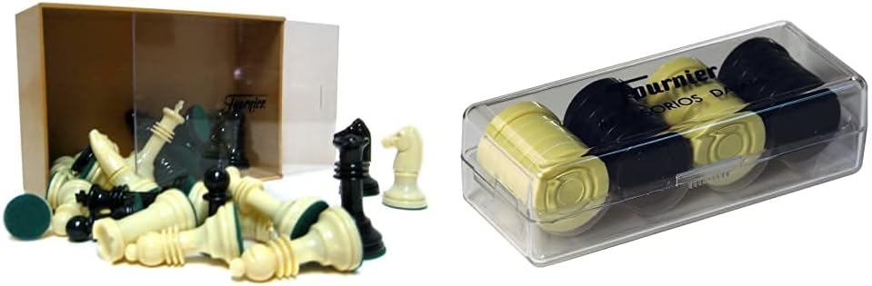 Completo conjunto de piezas de ajedrez Staunton nº 3 presentado en una práctica caja de plástico para su guardado y transporte. 38 piezas de ajedrez, 16 negras y 16 blancas