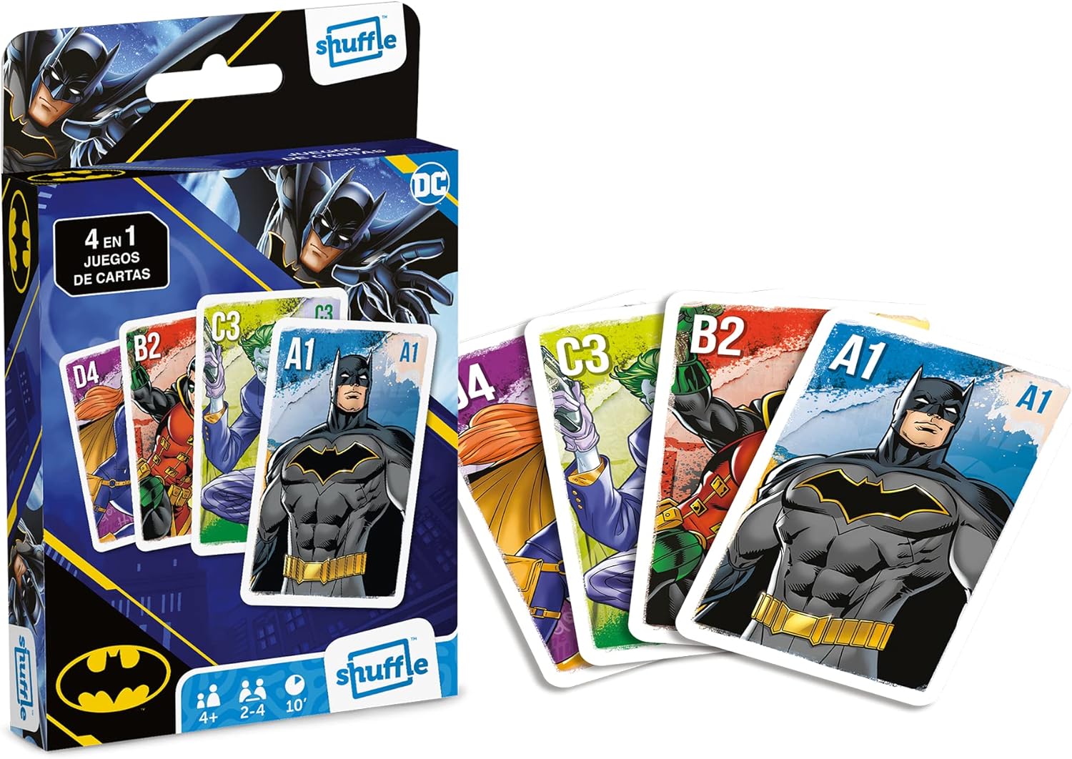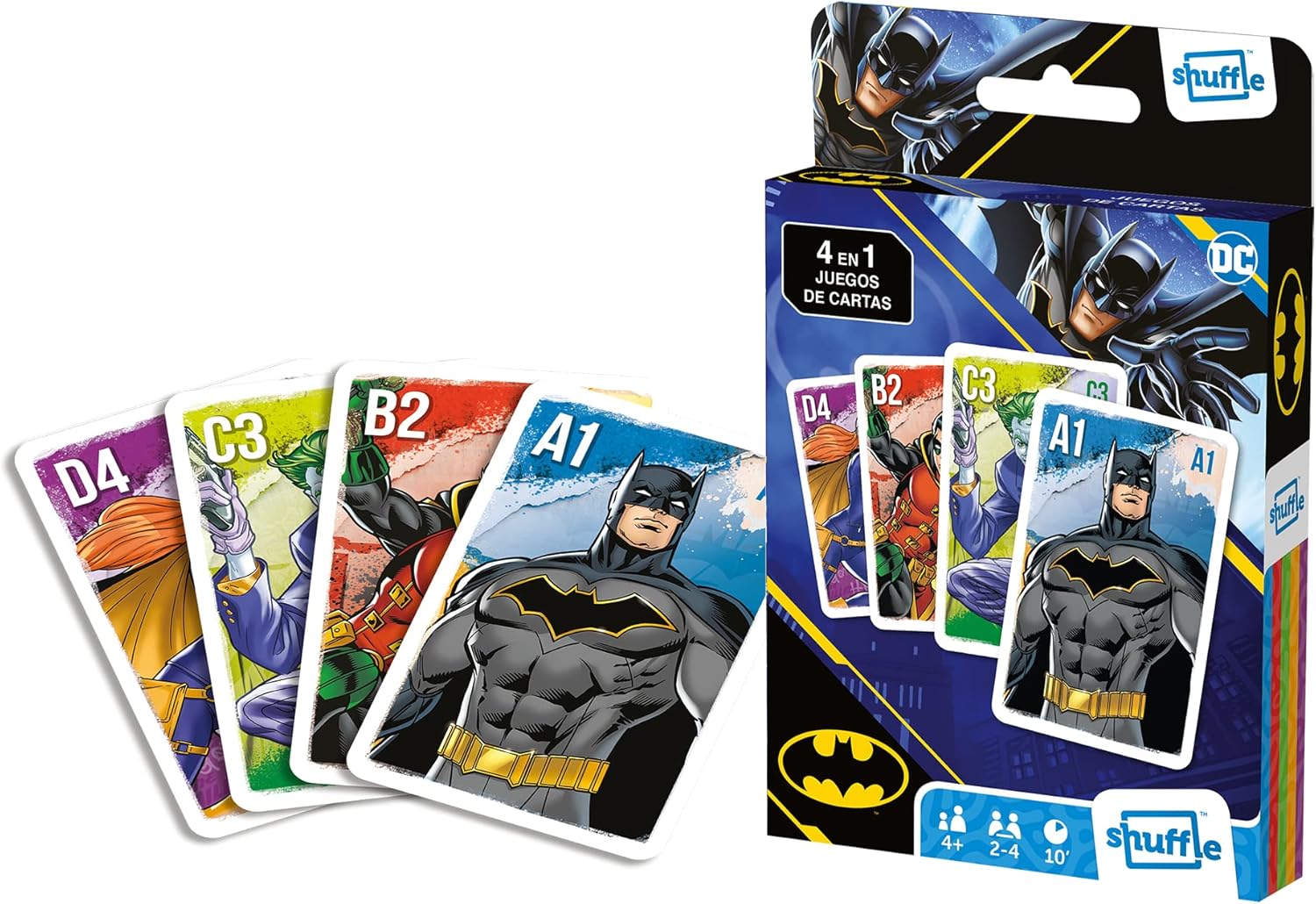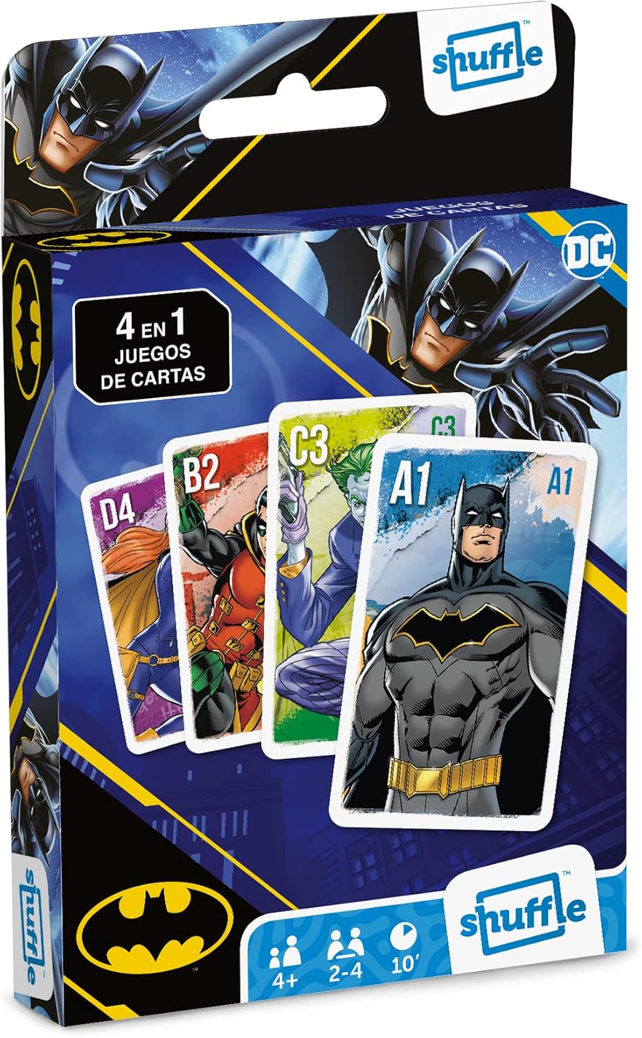Juego Shuffle Fun 4 Juegos en 1 de Batman (versión española). Juega al Snap, a las Familias, al juego de Parejas o al Juego de Acción con tus personajes favoritos de Batman. ¡4 juegos en 1! Contiene 1 baraja con 33 naipes de tamaño perfecto para las manos de los más pequeños. Para ganar en el Juego de Snap tienes que ser rápido y decir “SNAP” en cuanto veas dos cartas iguales; En el juego de las Familias tienes que recoger el mayor número de conjuntos o familias posibles; En el Juego de Acción tendrás que deshacerte de tus cartas siguiendo el mismo palo, cifra o símbolo que la carta del mazo central. Y en el juego de las Parejas, ¿quién identificará más parejas con la ayuda de su memoria? Incluye reglas de los juegos en español. Además hay vídeos e instrucciones, disponibles en 14 idiomas diferentes, para descargar online. También se incluye un folleto de instrucciones en el paquete. Recomendable para niños a partir de 4 años.