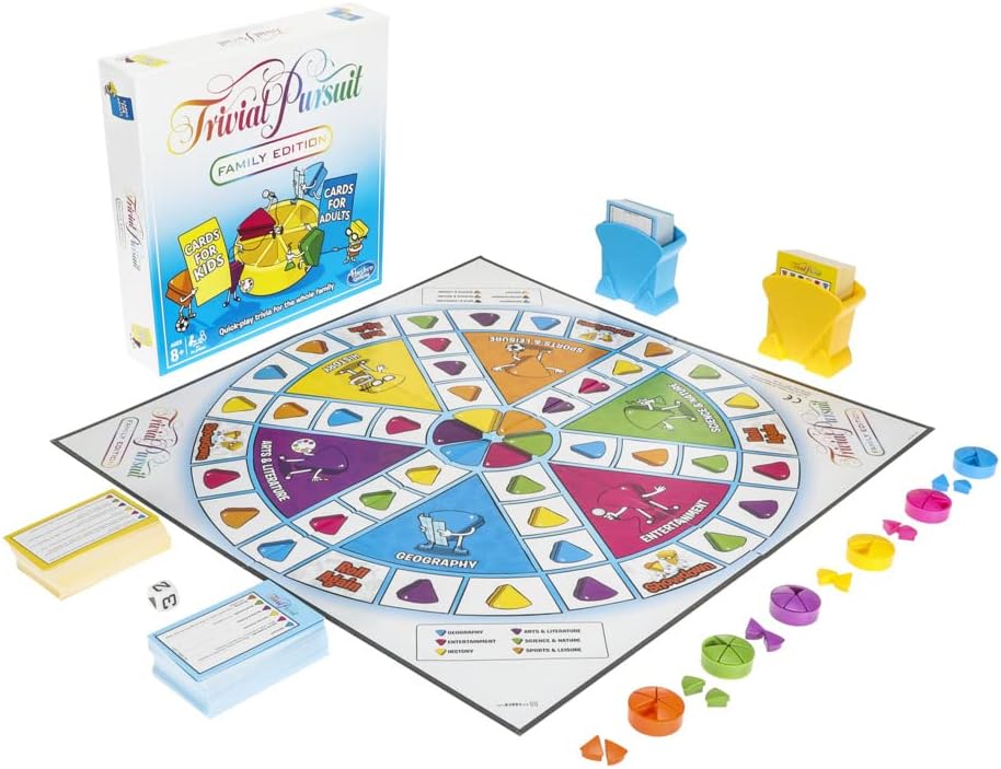 ¿Buscas una actividad que los niños y adultos puedan disfrutar durante el tiempo familiar? Prueba el juego Trivial Pursuit diseñado para familias. Incluye 2.400 preguntas para niños y adultos. Los jugadores pueden probar lo que saben con emocionantes preguntas de 6 categorías: Geografía, entretenimiento, historia, deportes y ocio, artes y literatura, y ciencia y naturaleza. Esta versión del juego se puede jugar más rápido que el tradicional juego Trivial Pursuit – ideal para la noche de juego.