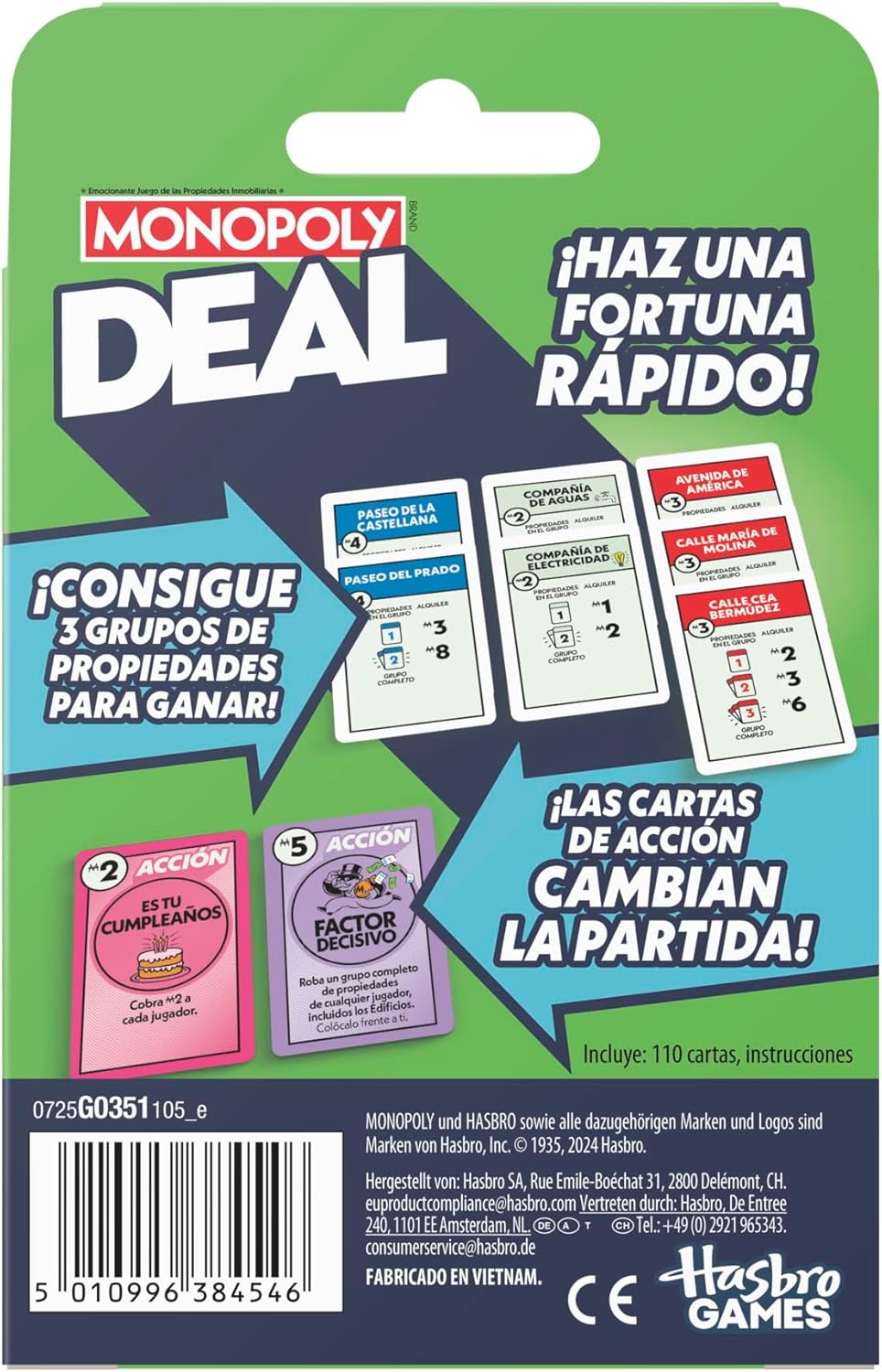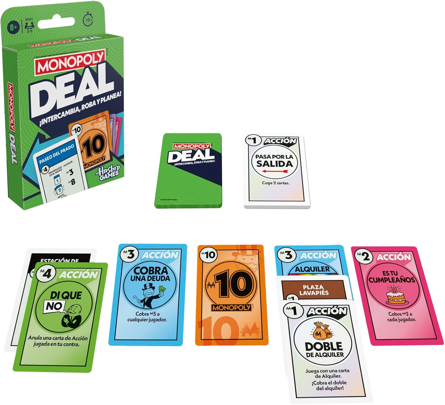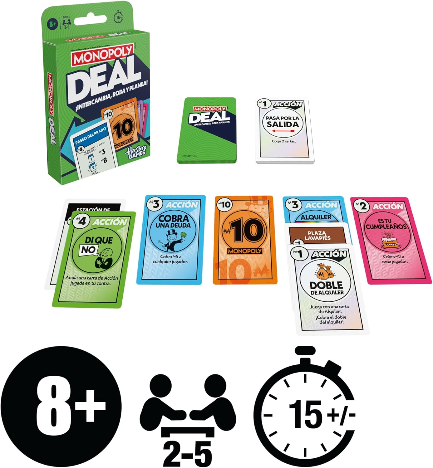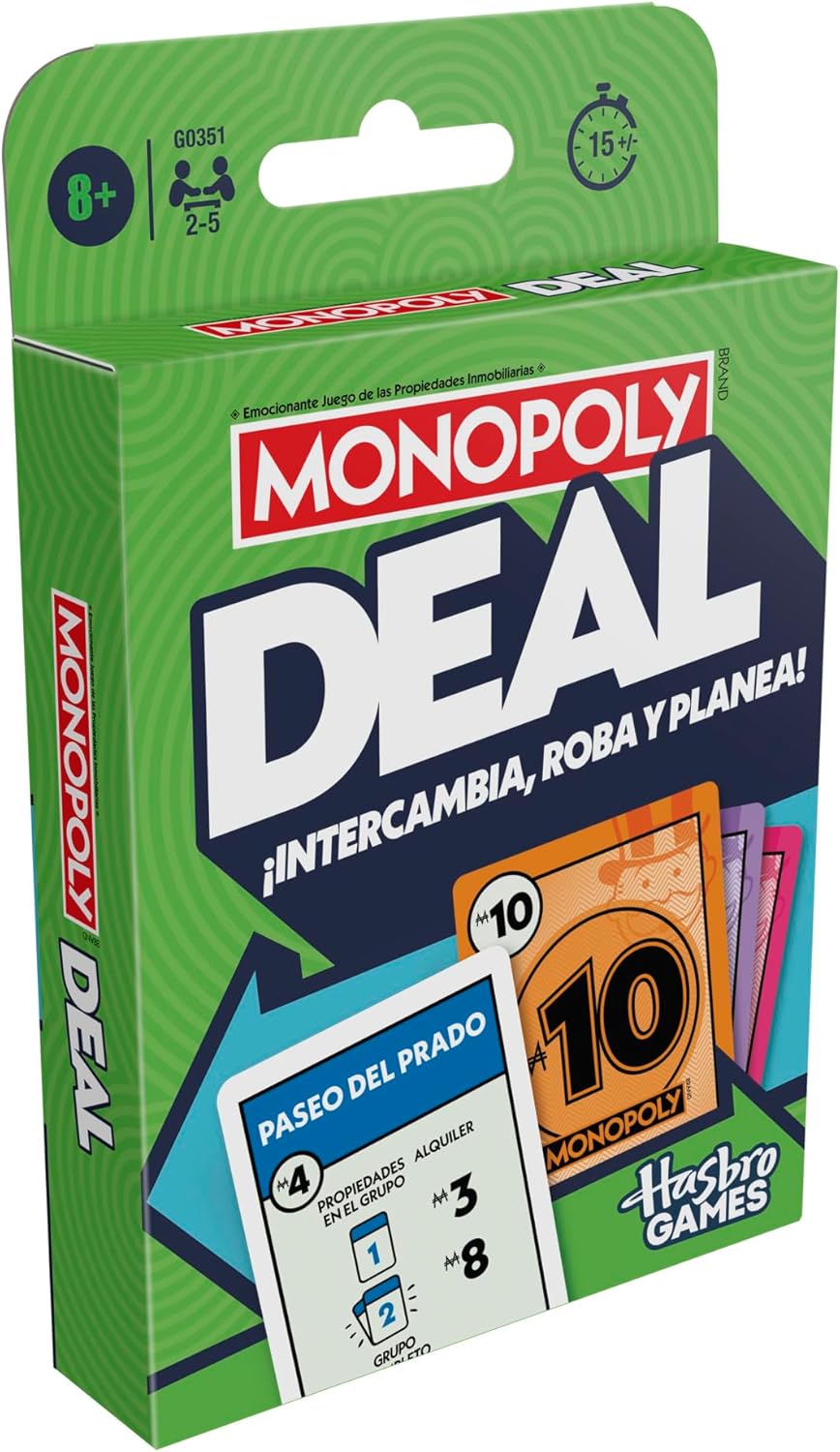 Trade, steal, and plan with the Monopoly Deal card game! Be the first player to gather 3 complete sets of property cards, each of a different color, to win. This deck includes 110 cards: property cards, property wildcard cards, action cards, and money cards Property Wild Cards help players assemble property groups. Action cards change the game allowing players to collect rent, steal and trade properties and more. And players pay their debts with money cards. This game is easily prepared and played in just 15 minutes. Recommended age: 8 years and up. If you are looking for fun family games or travel games for kids and adults, this game is an excellent choice. The Hasbro Gaming, Parker Brothers and Monopoly names and logos, the distinctive board design, the four corner squares, the name and character of Mr. Monopoly, as well as each of the distinctive elements of the board and game pieces, are trademarks of Hasbro, Inc. for your real estate operations game and gaming equipment.