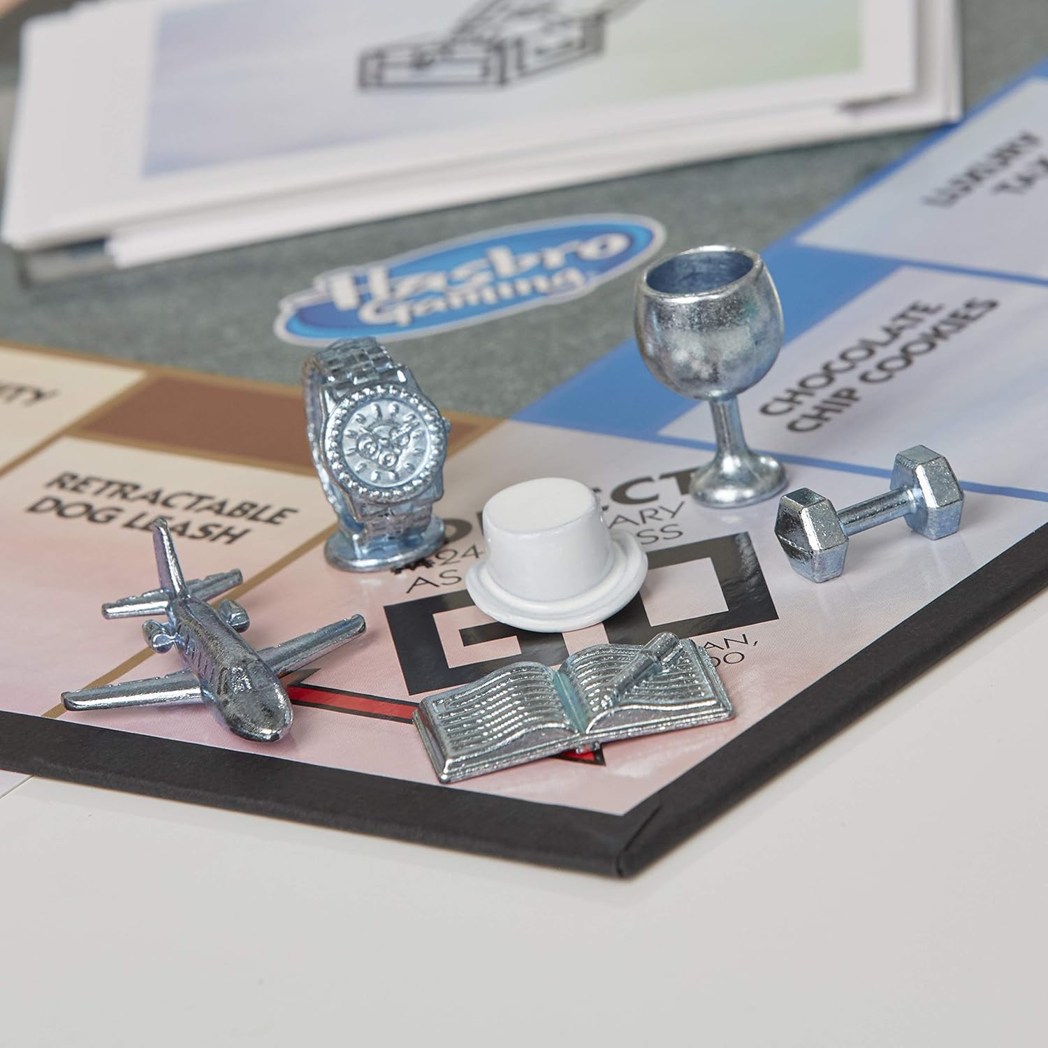 Muévate sobre el tablero utilizando una de las peines que representan Miss Monopoly: un portátil y un bolígrafo, un jet, un vaso, un reloj, un balancín o el sombrero blanco de Miss Monopoly.