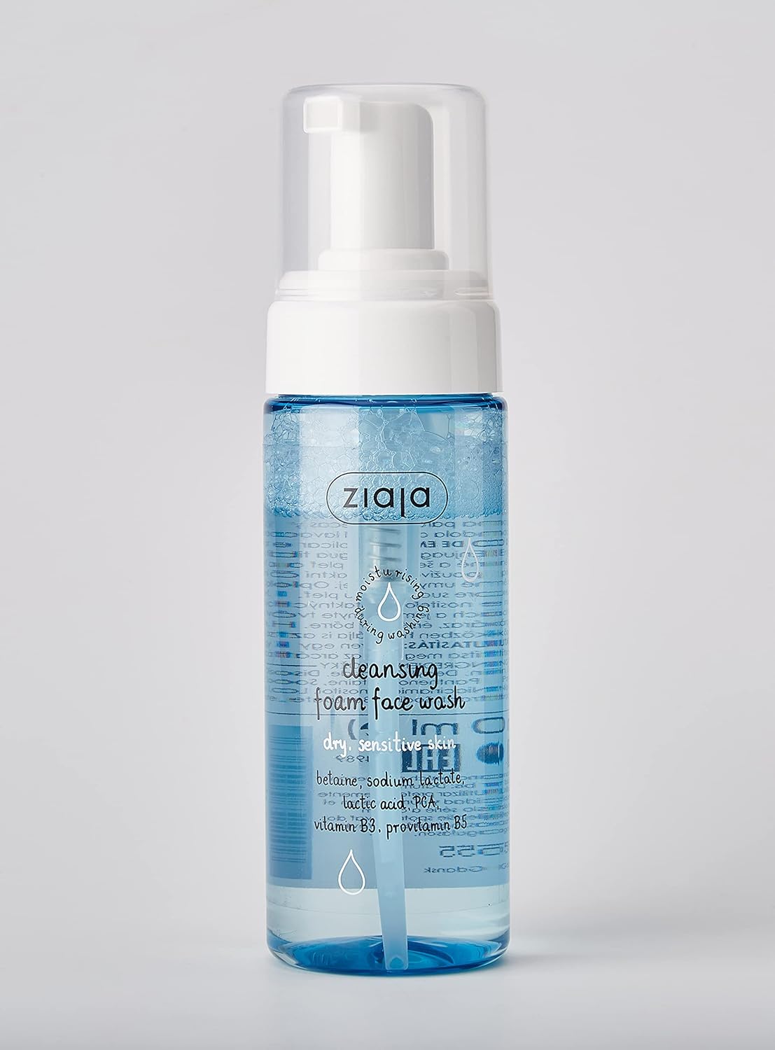 Foaming facial cleanser for dry and sensitive skin, formulated to gently cleanse the face while moisturizing the skin during washing.